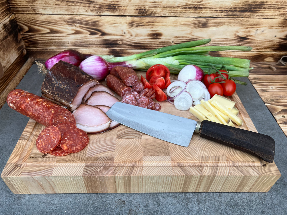 Tausendsasser Boum ähnelt in seiner Klingenform dem japanischen Santoku: dem Messer der drei Tugenden, da es für Gemüse, Fleisch und Fisch geeignet ist. Natürlich ist es auch über diese drei Zutaten hinaus ein vielseitig einsetzbares Kochmesser. Mit seiner großen, starken Klinge ermöglicht es leichtes und schnelles Arbeiten ohne Ermüdung. Tausendsasser Boum schneidet kinderleicht all das, was man zum Abendessen oder zur Brotzeit braucht: Brot, Käse, Tomaten, Wurst und Obst.