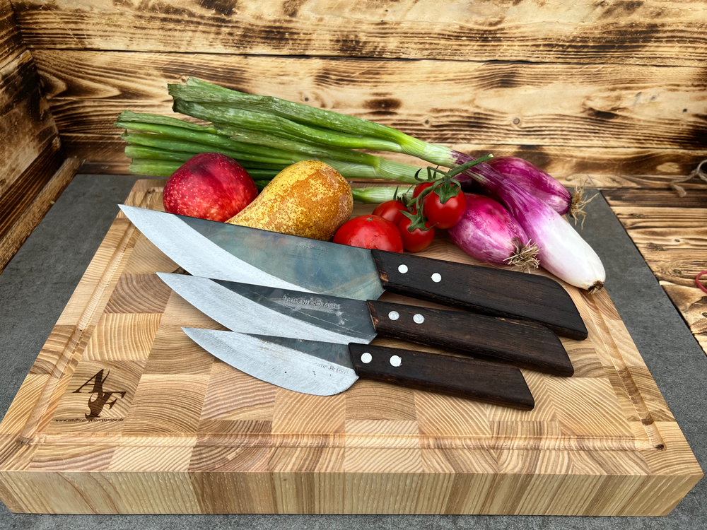 Die kleineren Varianten der Vay Serie sind gut für Kräuter geeignet, die größeren für Gemüse, Pizza oder als Tortenheber. Dabei gilt: je größer die Klinge, umso kleiner der Kraftaufwand. Das Gewicht des Messers arbeitet für uns mit. VAY gibt es in Varianten mit dünnen schwarzen und mit dicken polierten Klingen.